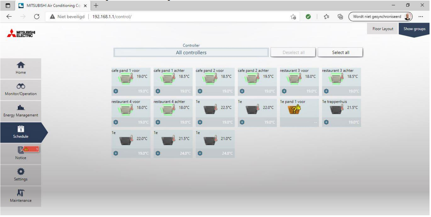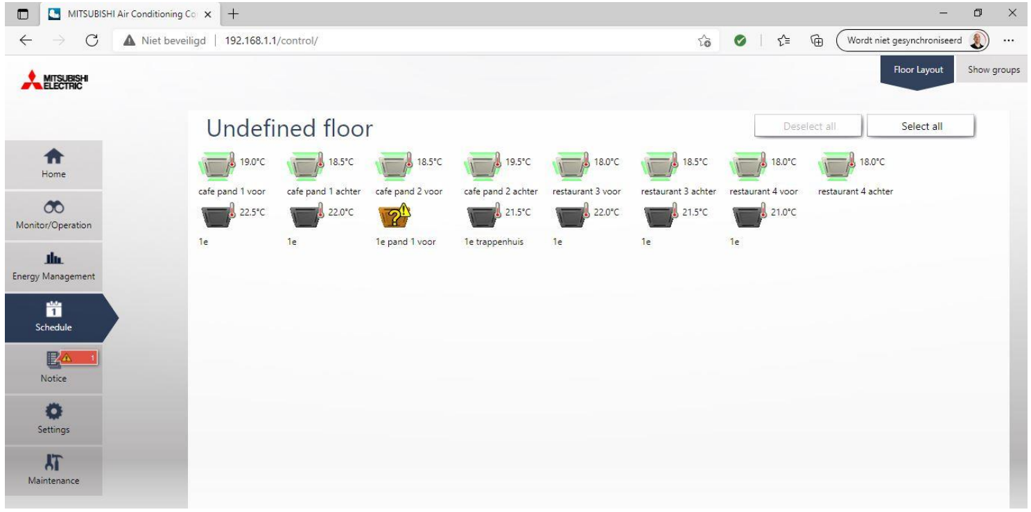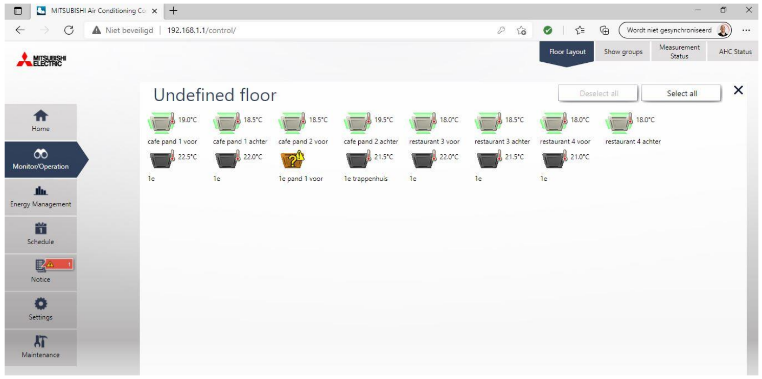 Een afbeelding van een unit met groene uitblaas tekens is een unit die inwerking is, een donker gekleurde is een unit die UIT staat, een gele is een unit met een storing, de details van de storing zijn te vinden onder Notice in de tabbladen aan de linker kant.