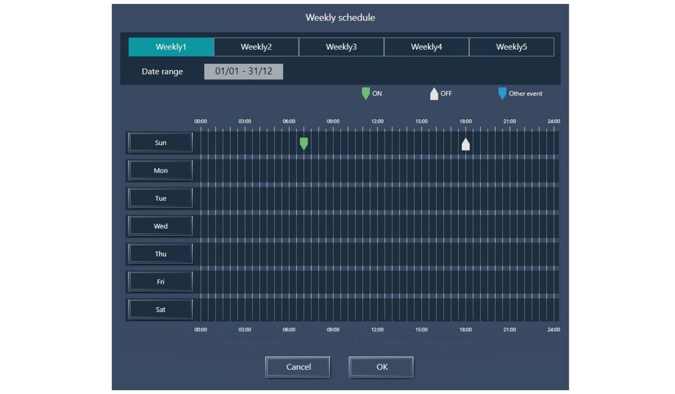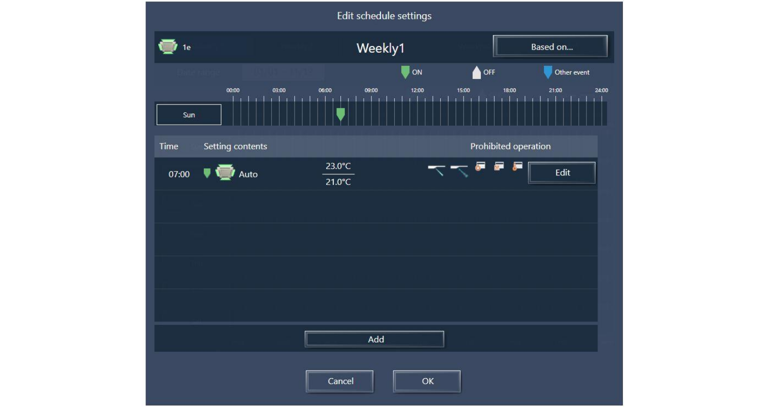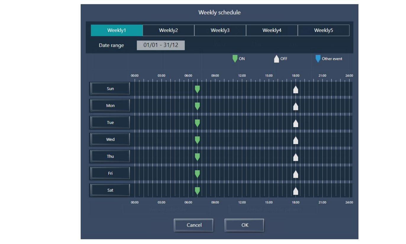 | Ma t/m Zondag | 15:00 ON Auto 21℃/23℃Ventilatie Automatisch 10:00 OFF |