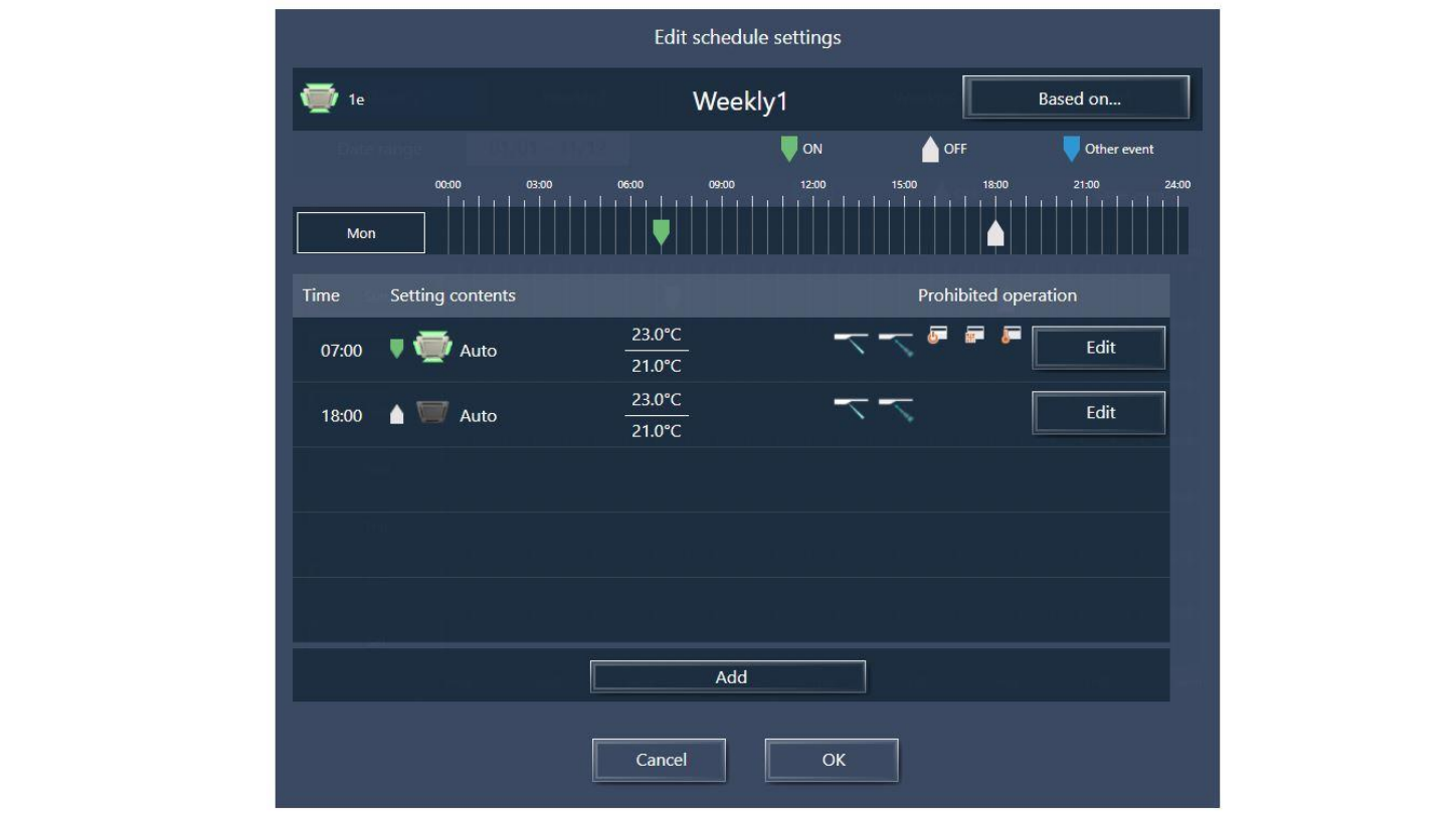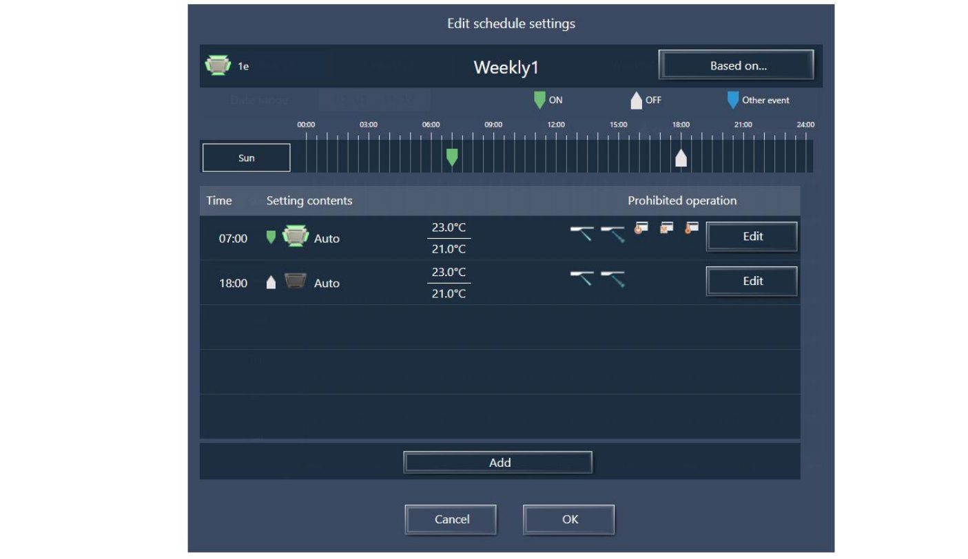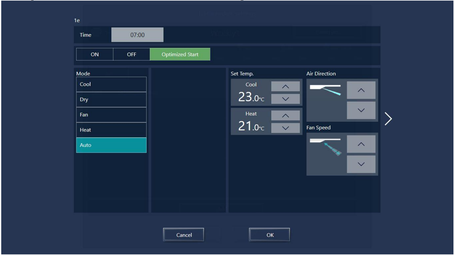 | Ma t/m Vrijdag: | 07:00 Optimized Start Auto 21℃/23℃Ventilatie Automatisch 18:00 OFF |