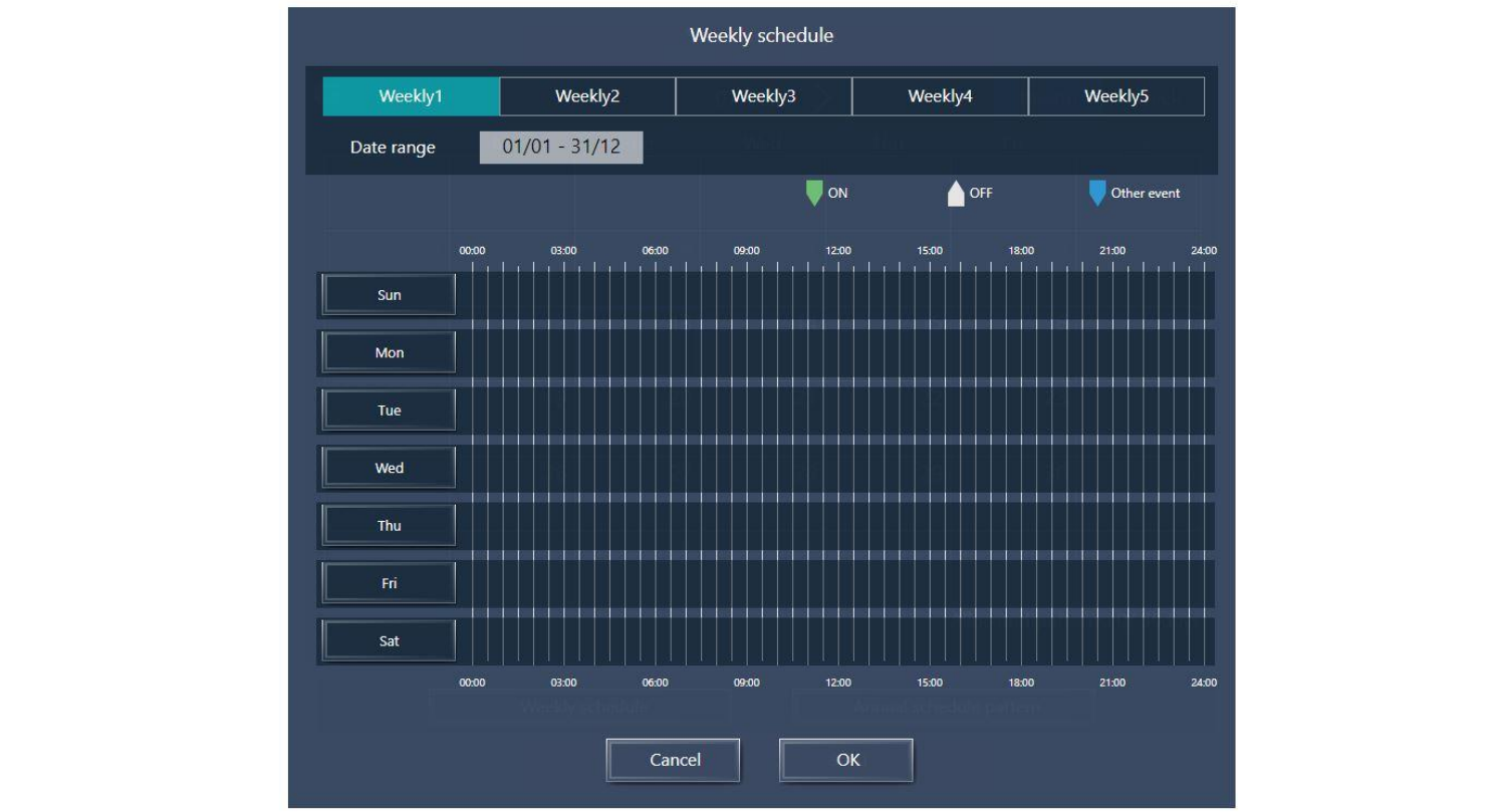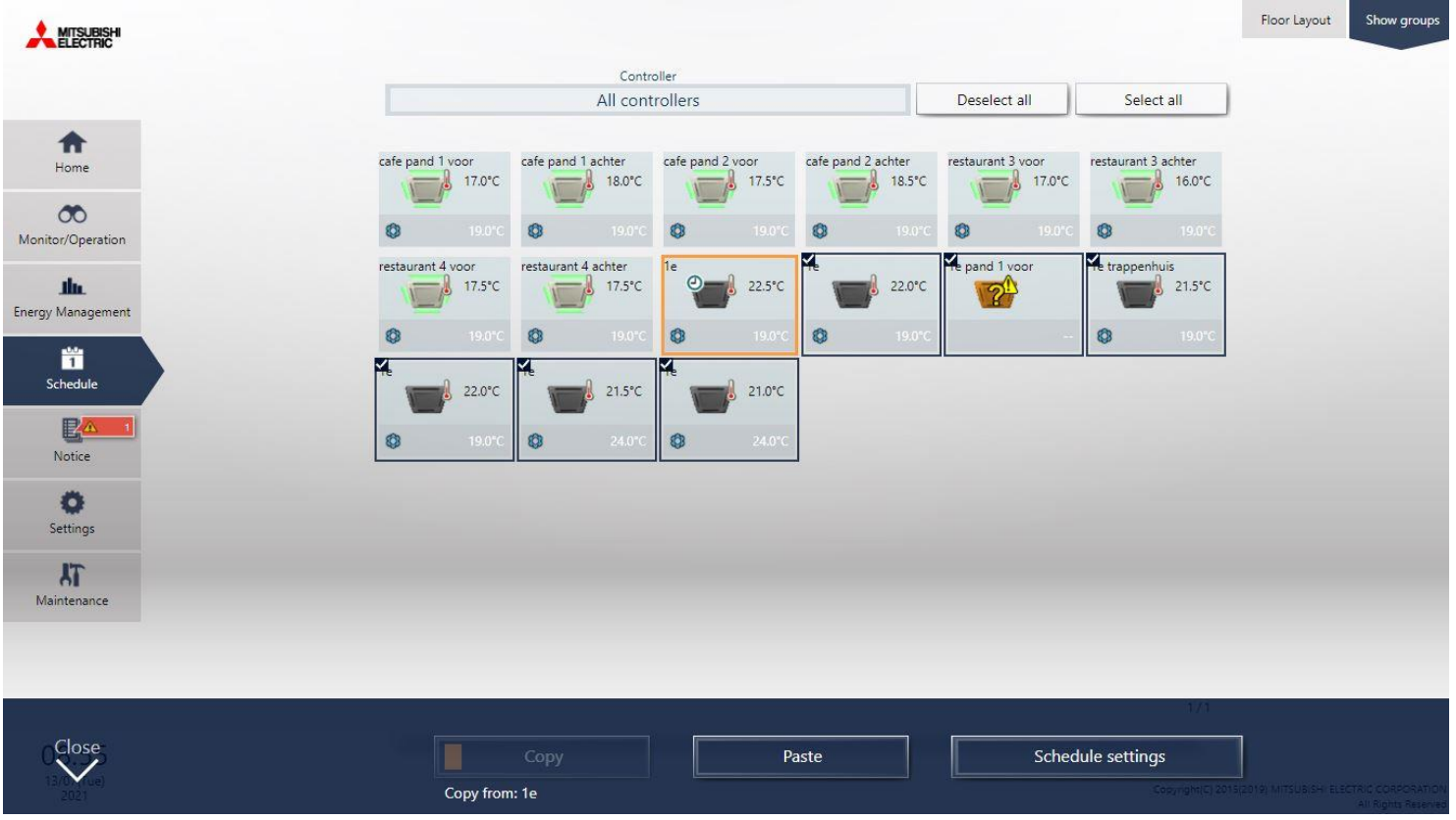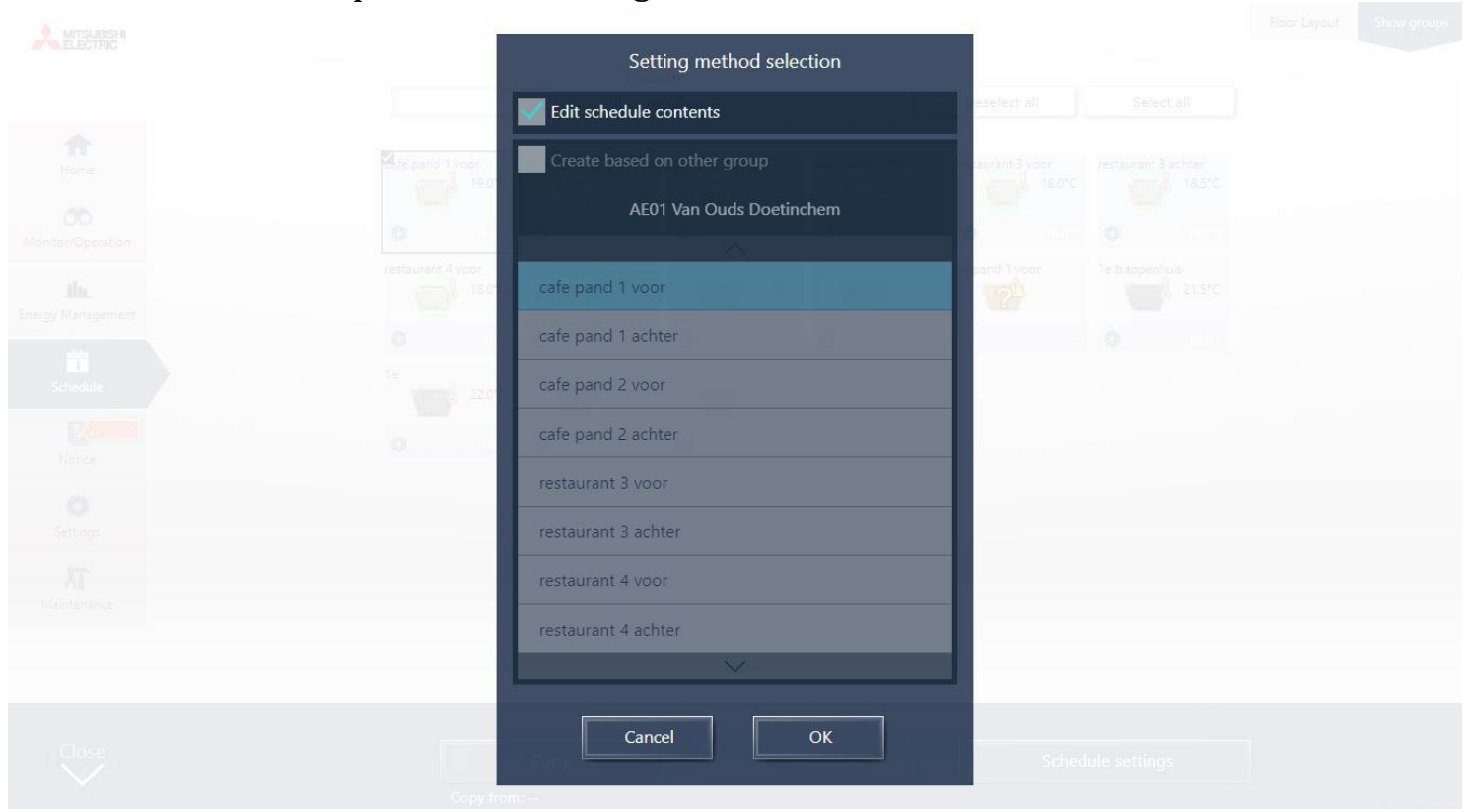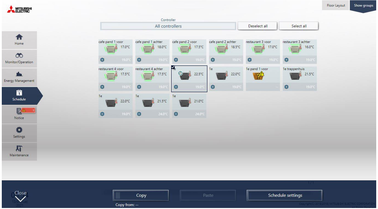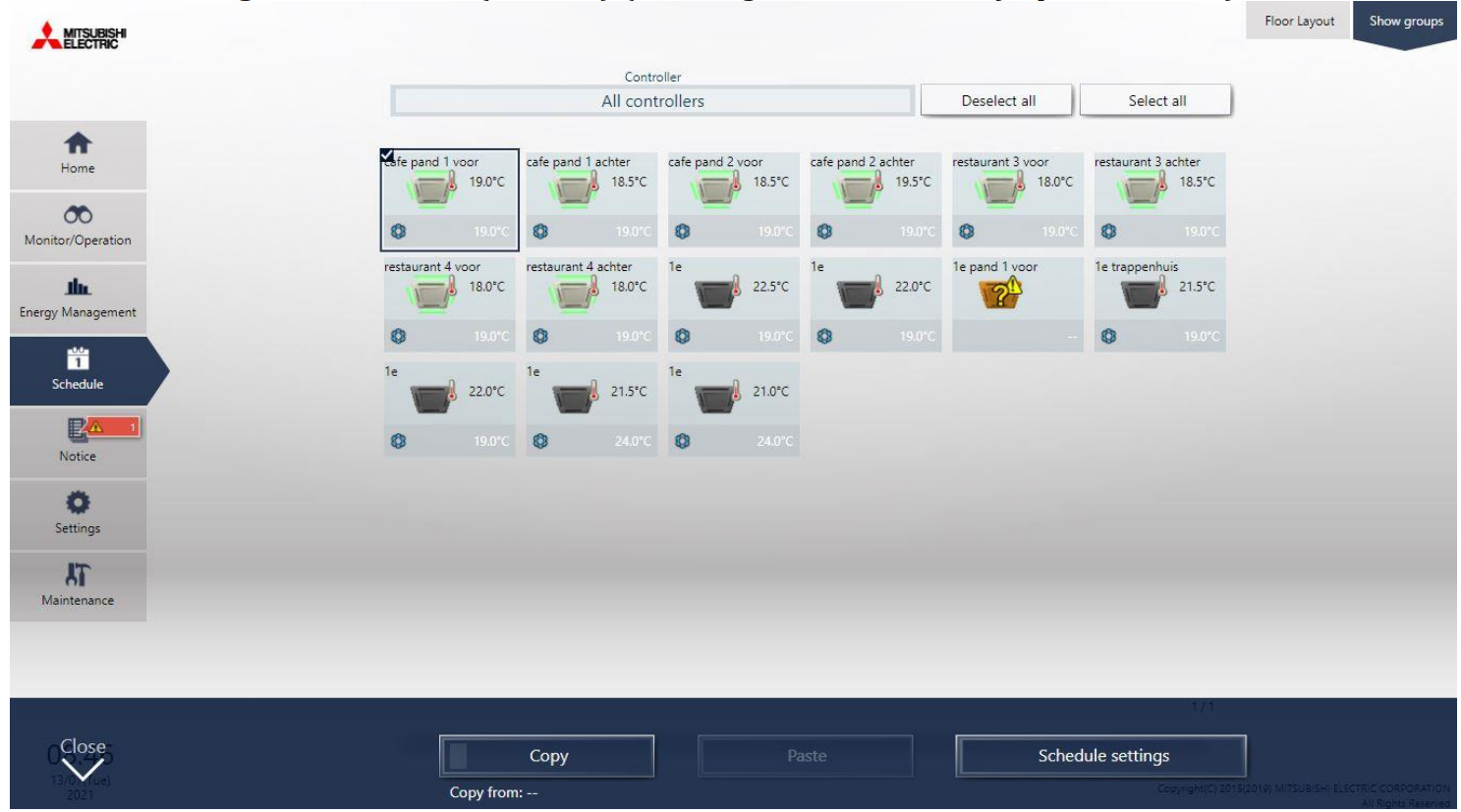 U kan er voor kiezen om elke unit een individuele weekklok te geven of om deze te kopiëren dat doet u door de ingestelde unit in het tabblad Schedule te selecteren. En vervolgens op Copy te klikken links onderin.
