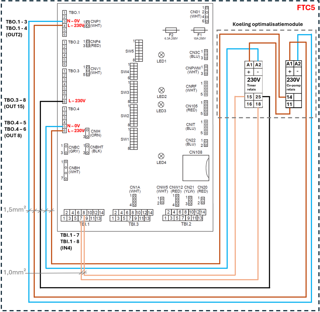 Zodra de warmtepomp in koelbedrijf staat zal output 8 (TBO.4 7-8) bekrachtigd worden met 230V / 0,5A max. en deze stroom zal fungeren als voeding voor het “timer” relais.