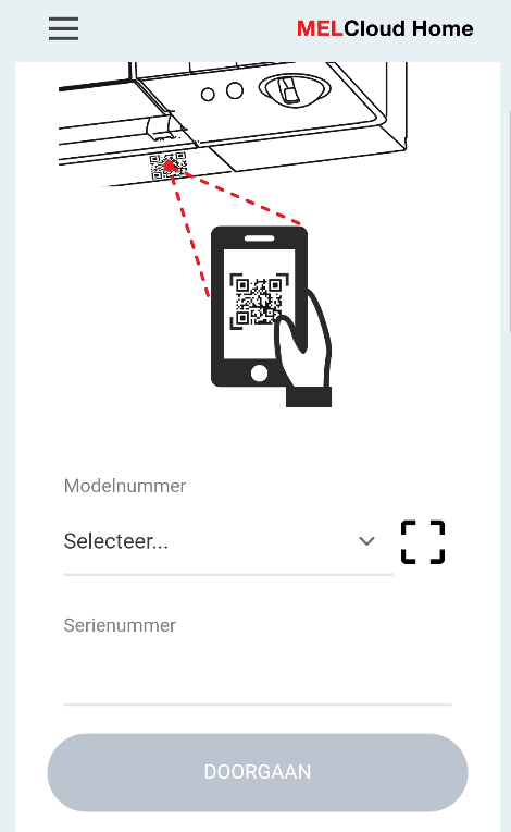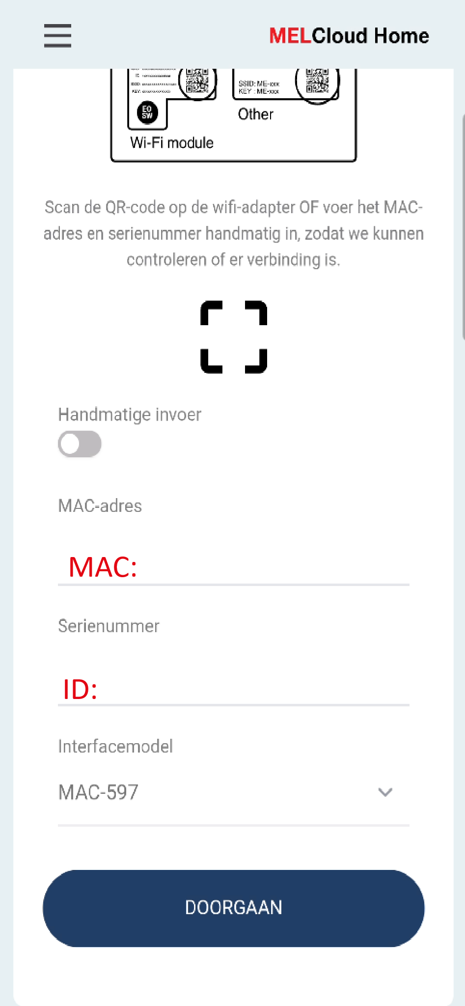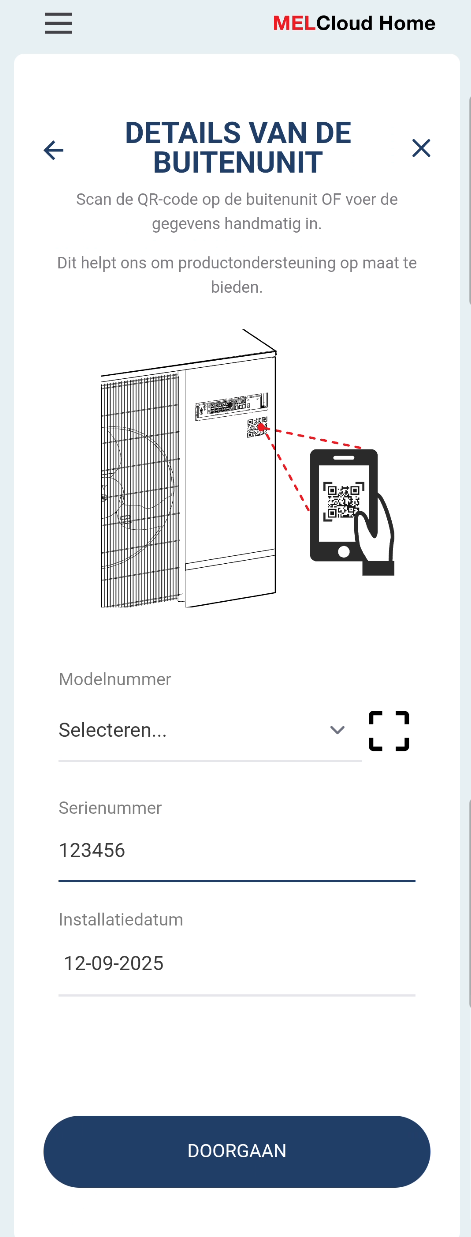 16. Vul de gegevens van het buitendeel in. Dit kan door de QR-code te scannen of handmatig in te vullen als je niet bij het buitendeel kan.