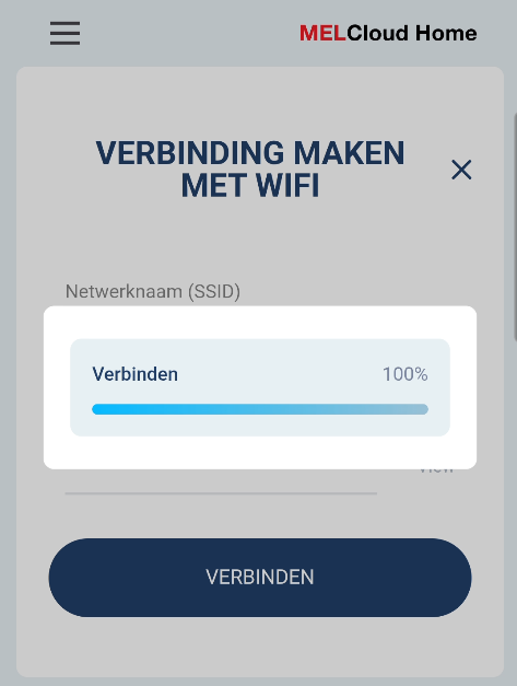 12. Wacht tot de module is verbonden met het Wi-Fi netwerk. Net als bij het bluetooth verbinden kan dit wat langer duren. Het kan zijn dat die op 100% ook nog even blijft hangen. Blijf wachten tot de app vanzelf doorgaat.