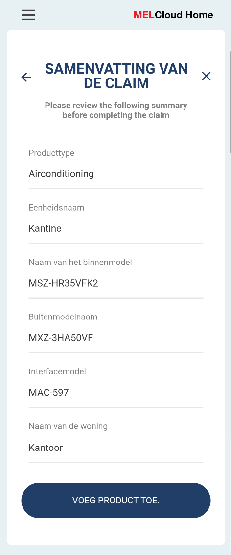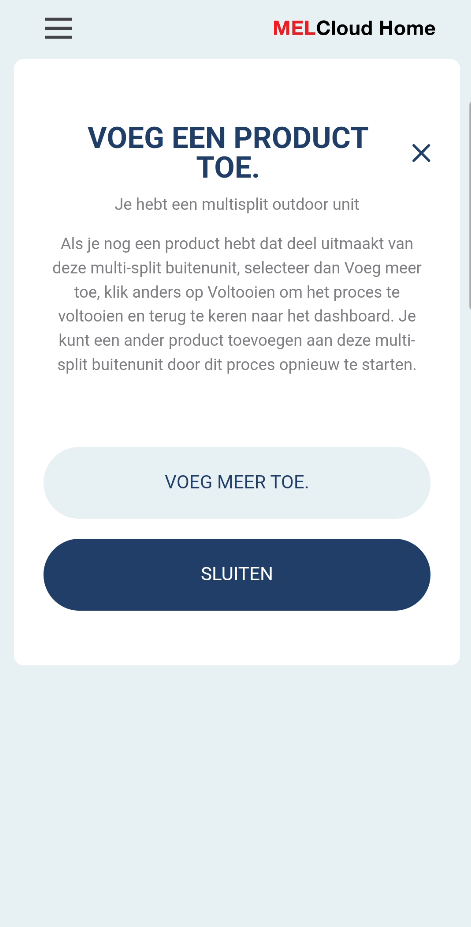 21. Tot slot zie je het volgende scherm. Heb je een multi-split buitendeel waar dus nog een binnendeel op is aangesloten klik dan op "VOEG MEER TOE." en ga naar stap 17.
