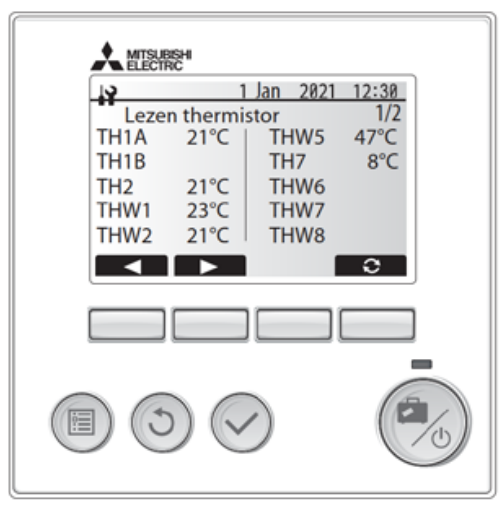 Via menu service lezen thermistor is snel een overzicht van de diverse thermistors te genereren. De betekenis van alle sensoren is terug te vinden in het hoofdstuk ‘meetgegevens’. Op basis van de thermistors en het waterdebiet kan bijvoorbeeld het geleverd vermogen worden berekend. Via menu service lezen thermistor kun je snel een overzicht van de diverse thermistors genereren.