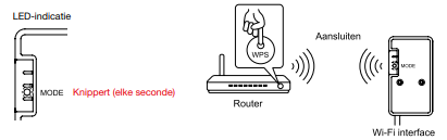 Controleer of de LED-indicatie van de WiFi-interface eruitziet zoals hiernaast weergegeven. Druk op de Mode-knop totdat het Mode-lampje knippert. Druk vervolgens binnen 2 minuten op de WPS-knop van de router.