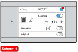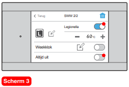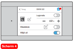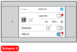 / Scherm SWW 2/2 is zichtbaar en boven in staat ‘Legionella’ zet het schuif icoon om naar rechts om legionella bescherming in te schakelen. Onderin staat het schuif icoon ‘Altijd uit’ zet het schuif icoon om naar links om tapwaterbereiding in te schakelen.