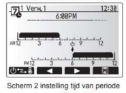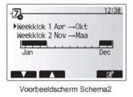 3. Met de pen rechts onderin kan de looptijd worden aangegeven voor weekklok 1 en weekklok 2. De zwarte balk geeft aan wanneer weekklok ½ van toepassing is.